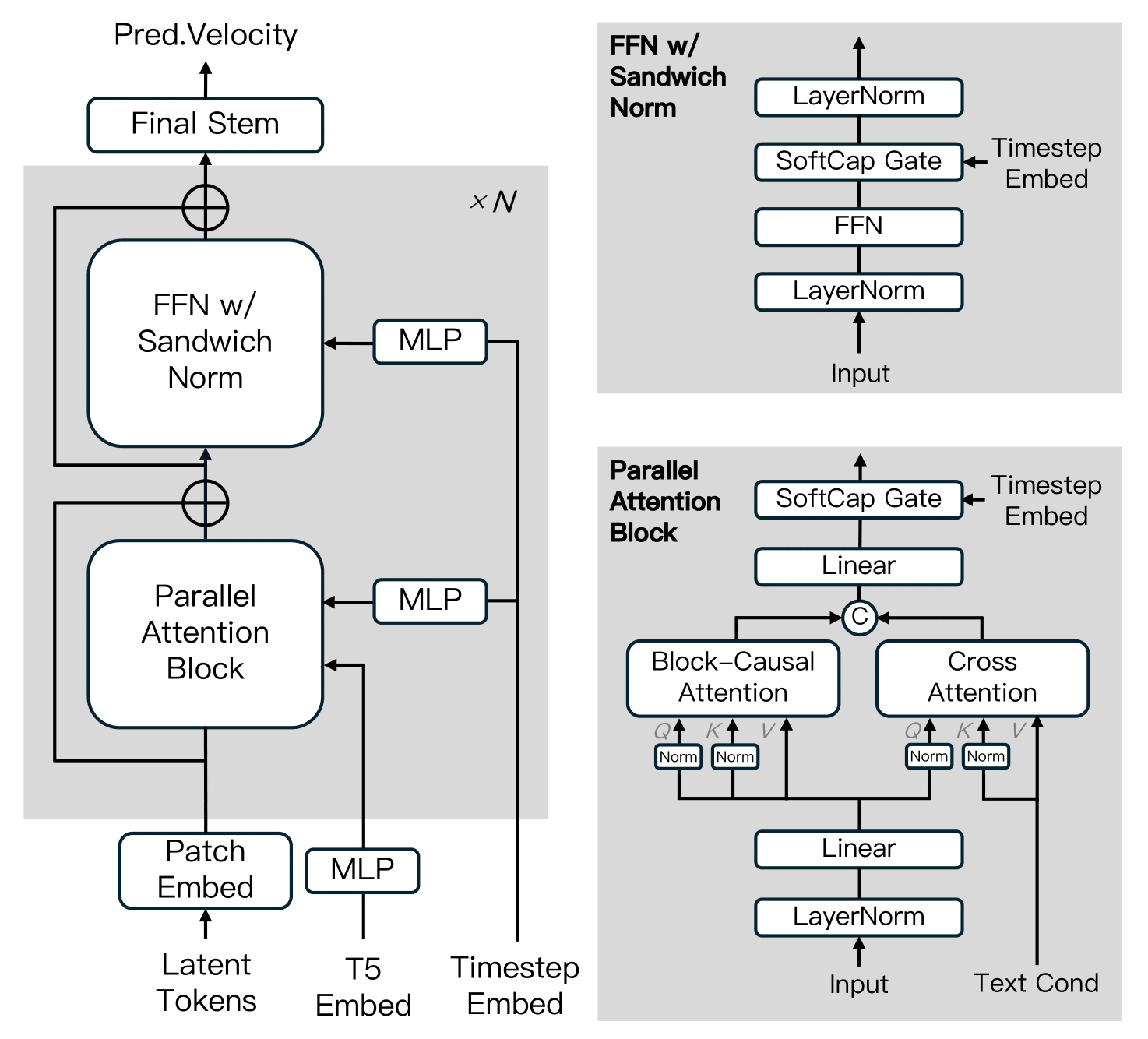 MAGI-1 is built upon the Diffusion Transformer, incorporating several key innovations to enhance training efficiency and stability at scale. These advancements include Block-Causal Attention, Parallel Attention Block, QK-Norm and GQA, Sandwich Normalization in FFN, SwiGLU, and Softcap Modulation.